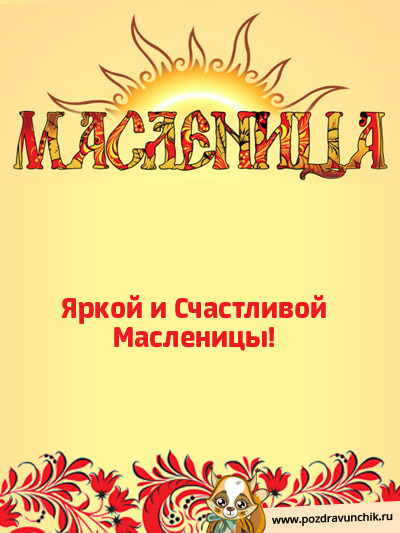 Масленица – это праздник, который учредили еще наши далекие предки. Он был посвящен весеннему солнцестоянию, периоду, когда природа готовилась к обновлению и вступлению в новый цикл. В это время славяне собирались на лужайке, жгли чучело зимы, танцевали, пели, ликовали в ожидании весны, угощали друг друга блинами. Сегодня, как и много лет назад, русский народ обожает Масленицу - за веселье и за масляные пиры. Основным угощением Масленицы являются блины, мед и топленое масло. Почему блины? Уж очень похожи круглые зарумянившиеся «полотна» из теста на весеннее солнышко. Поздравить друзей, коллег, членов семьи с Масленицей красивой открыткой – это здорово. Выбрать открытку на Масленицу по душе, можно зайдя на сайт Поздравунчик.ру. С Масленицей вас, дорогие посетители нашего интернет-ресурса! Поздравунчик.ру желает вам хорошего настроения и приятного времяпрепровождения!