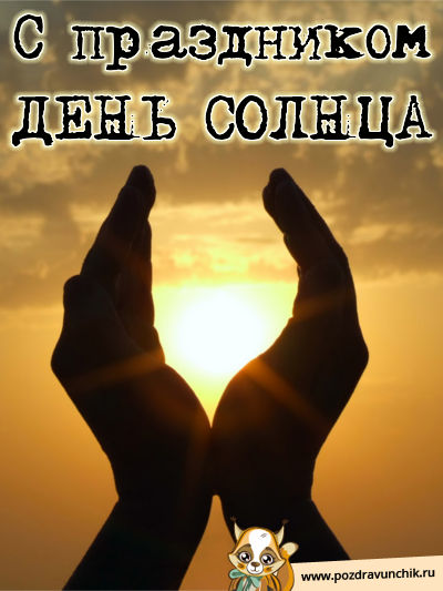 Несмотря на то, что день солнца — сравнительно молодой праздник, с каждым годом его празднует все большее количество людей. Учрежденный 3 мая 1994 года Обществом солнечной энергии, праздник призван напомнить нам, что только все вместе мы сможем спасти экологию нашей планеты. Первый и решающий шаг — отказ от горючих источников энергии и переход на экологически чистую энергию солнца, ветра и воды, а также использование биотоплива. Этот праздник — прекрасный повод поделиться радостью. Отправьте своим близким и родным открытку на день солнца и вы увидите, насколько светлее станет ваш день. Нет ничего приятнее, чем просто так подарить человеку кусочек счастья. Портал Поздравунчик.ру как всегда спешит на помощь в вопросе поздравлений! Каждвая открытка в этой рубрике уникальна и создана специально для вас!